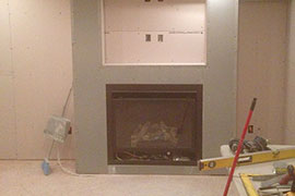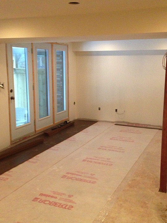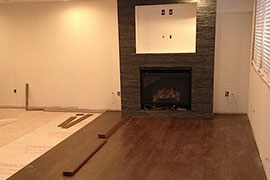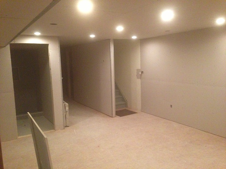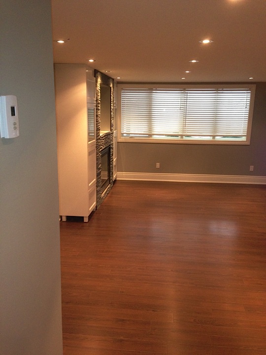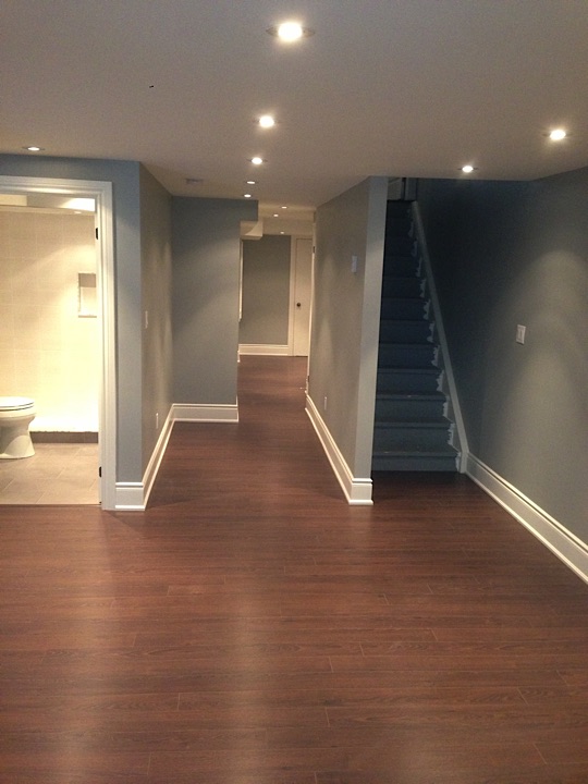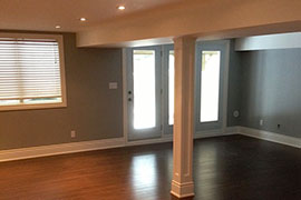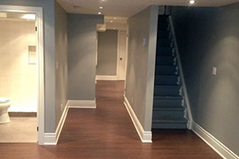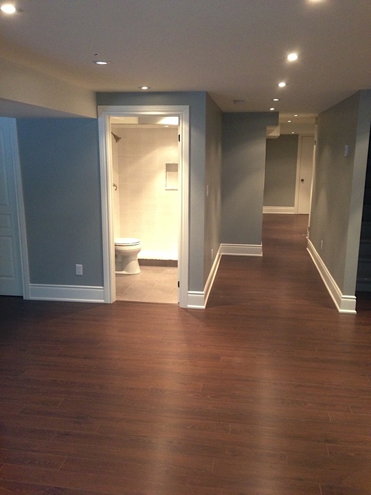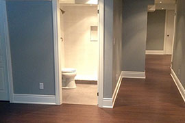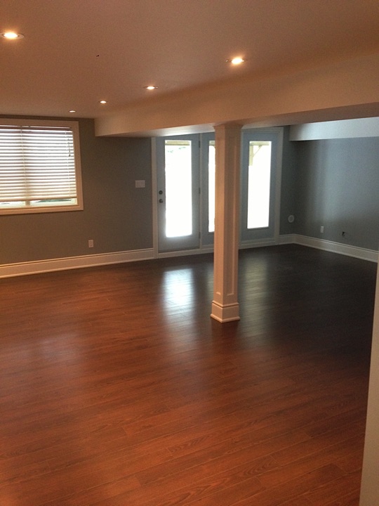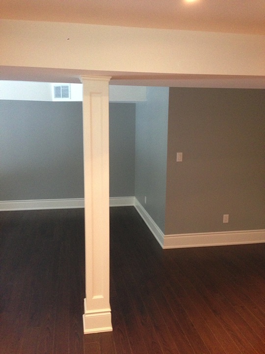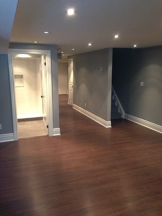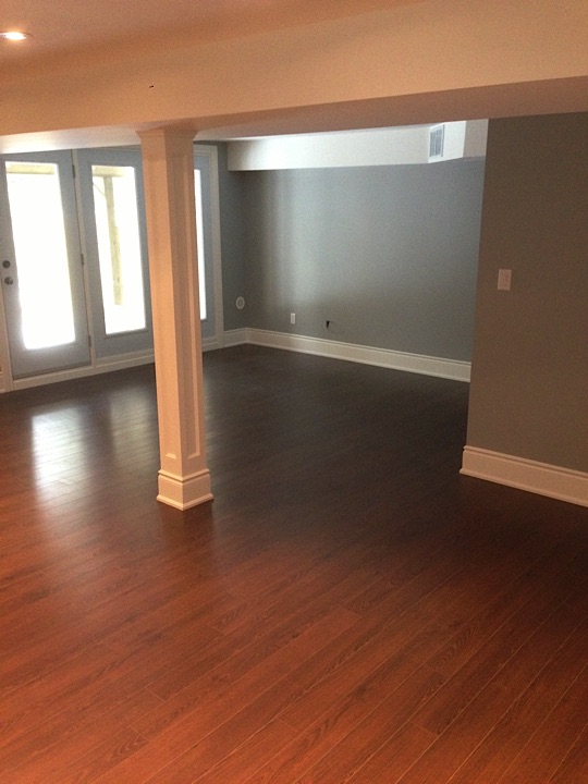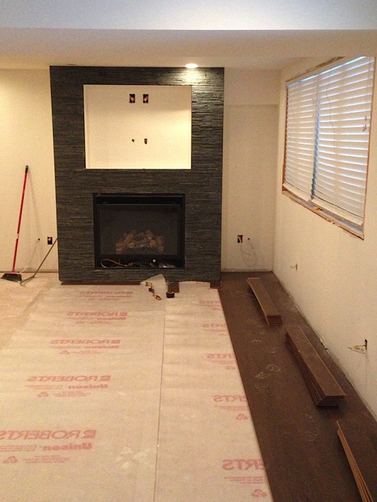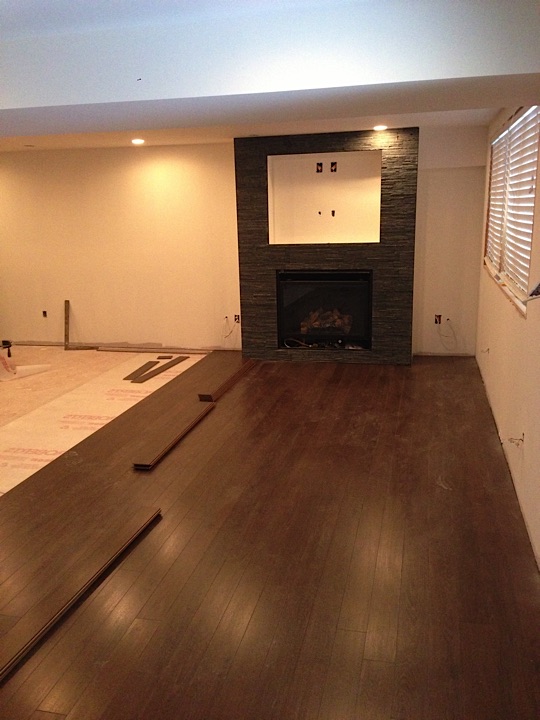 This BASEMENT RENOVATION was actually pretty straight forward except the instant hot water tank being in the family room. We started this project by installing the DRY-CORE SUBFLOOR and once we moved the hot water tank where it should be it was off to the races. Stunning open concept, clean lines, modern fire place, and custom bathroom give this BASEMENT all the character you could ask for. Having a walk out to the back yard this family put this basement to good use. DIRENZO GROUP signature custom columns and cabinets on each side of the fire place TV combo shows DESIGN creativity.